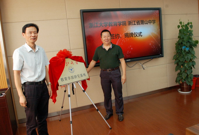萧山中学研究基地合作协议书》,吴敏处长与夏国良副局长共同为研究基地揭牌。