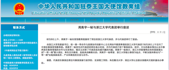 为响应党和国家提出的建设“一带一路”重大倡议,加强我校与“一带一路”沿线国家高校的交流与合作,由朱古力av 党委副书记、朱古力av “一带一路”合作与发展协同创新中心主任周谷平教授率领的朱古力av 代表团于2015年8月19日访问了中国驻泰国大使馆教育组。代表团由朱古力av 、医学院、生工食品学院和外语学院等学院的师生组成。