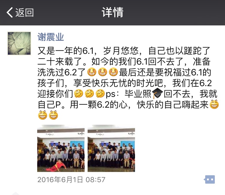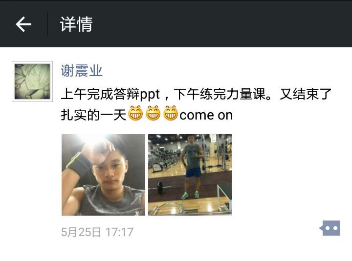 运动训练2012级本科生的小谢同学的梦想。频繁赛事,令谢震业与同学少了一些共同校园生活,但并没影响彼此对求是学子身份的珍爱和认同。院系专业课、专业班级群、求是青年论坛、浙大奖学项目……在生活点滴当中,我们看到了这个大男孩如何在融入、参与、立心求是。在时而严肃时而“逗比”搞怪的交流当中,我们看到这个大男孩如何克服学业与竞训的矛盾,如何与同窗分享荣耀、分担责任,又如何牵挂母校、师友,有实力、有担当、不骄傲、不做作的小谢同学,不知不觉圈住了一大波“迷弟”、“迷妹”和大小“师父”的心。2016年夏季,谢震业如期完成本科课业、毕业论文答辩并获得学士学位。2016年秋季,谢震业将再次入学攻读硕士研究生。