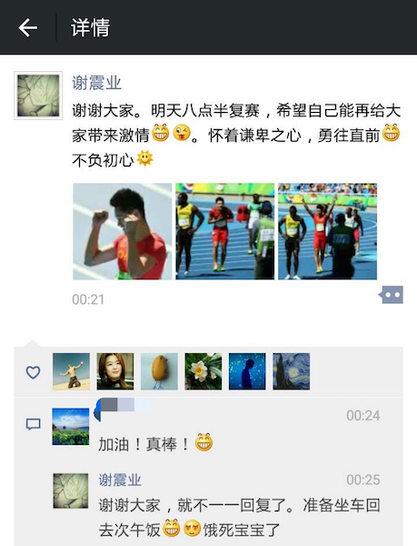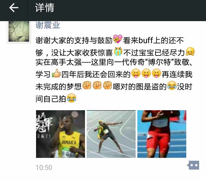 突破自己,是作为中国运动员的谢震业的梦想:这是谢震业第一次参加奥运百米飞人大战,与博尔特等名将同场竞技。而众所周知,他的主项并非100米。回顾2016奥运田径男子100米赛程,小组赛中谢震业跑出10秒08成绩,提高个人最好成绩0.04秒,中国运动员首次以小组第一晋级100米半决赛。“怀着谦卑之心,勇往直前,不负初心”,赛事间隙,谢震业朋友圈刷文,理性看待国际水平差距、追逐青春梦想、勇敢突破自己,赢得一众同窗、师长和好友点赞。