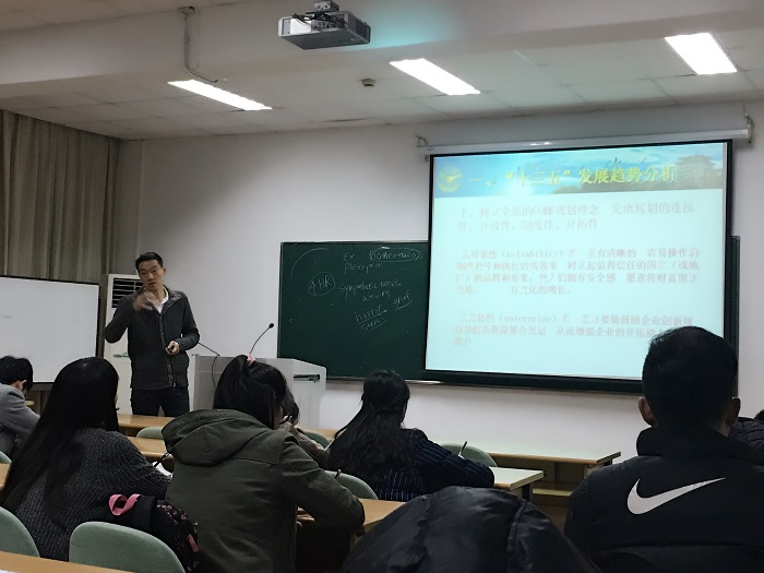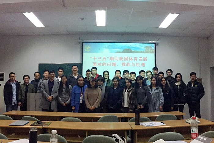 王进老师首先向各位党员详细地讲述了“十三五”期间我国整体发展趋势分析,包括区位经济发展走势、生态文明建设、战略性新兴产业发展、规划理念等,并强调指出,十三五规划时期是我国现代化建设进程中非常关键的五年,将更加突出以人为核心的发展。接着,王老师从竞技体育、群众体育、体育产业三个方面呈现了“十一五”“十二五”规划期间体育事业的发展情况,并介绍了“十三五”期间的体育事业发展计划。王进老师指出,“十三五”期间将是中国体育发展的快速增长期,机遇与挑战并存,在体育均衡化、体育绿色发展、体育发展的可持续性、体育产业的转型发展、城市发展中体育功能的发挥、体育发展的社会参与等方面都面临着巨大的挑战。