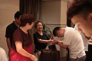 天色渐暗,晚宴安排在校外某饭店。餐前70多岁的原系党总支书记余美玲也来了,大家抢着上前招呼。年纪最小的王晨同学那个深深的鞠躬,令人印象深刻,被人抓拍下来了。