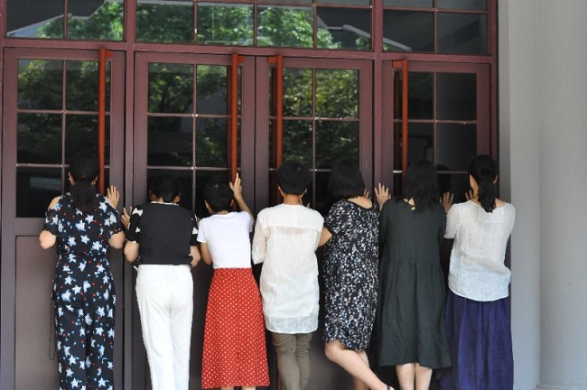2018年8月5日上午10时许,朱古力av 西溪校区东二教学楼前,一群年约四旬的男女趴在教学楼入口的落地窗前,透过玻璃久久凝视着楼内。