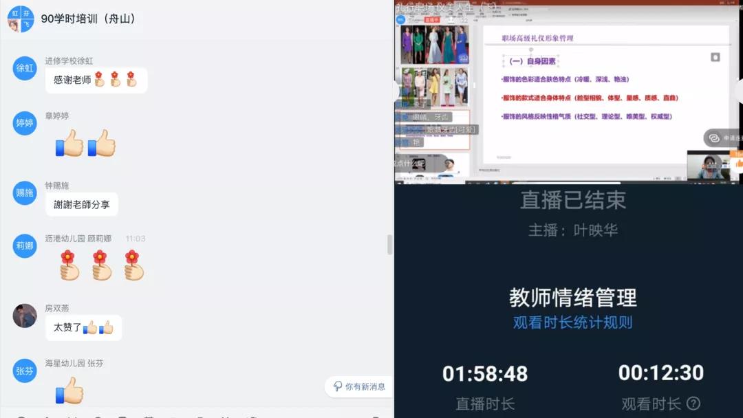 学院课程与学习科学系副主任叶映华教授作题为《教师情绪与压力管理》的线上培训,课程聚焦“教师压力”,通过经典案例分析,帮助参训教师更好地进行情绪管理和压力调控,以更加积极、乐观的心态面对工作与生活。学院党委副书记包松副教授以《礼行职场,仪美人生》为主题,通过贴近生活的案例帮助大家明白礼仪与职场的紧密关系,并鼓励教师们积极调整自身、关注生活细节,更好地满足学生发展和工作需要。第一阶段的线上课程,课程互动积极、讨论热烈,参与总人数近300人,点赞数达900次。
