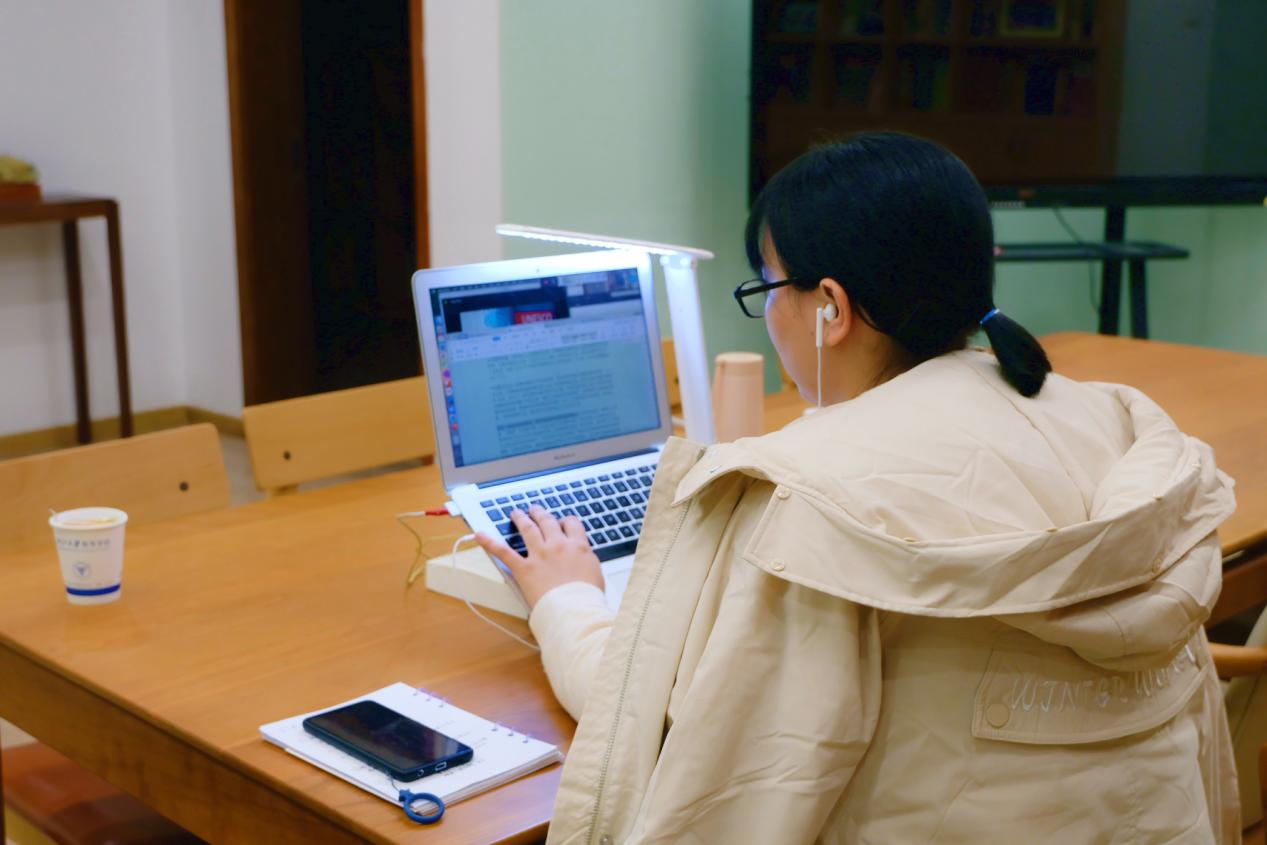 图为2020年12月徐冰娜于朱古力av 会议室做线上会议记录