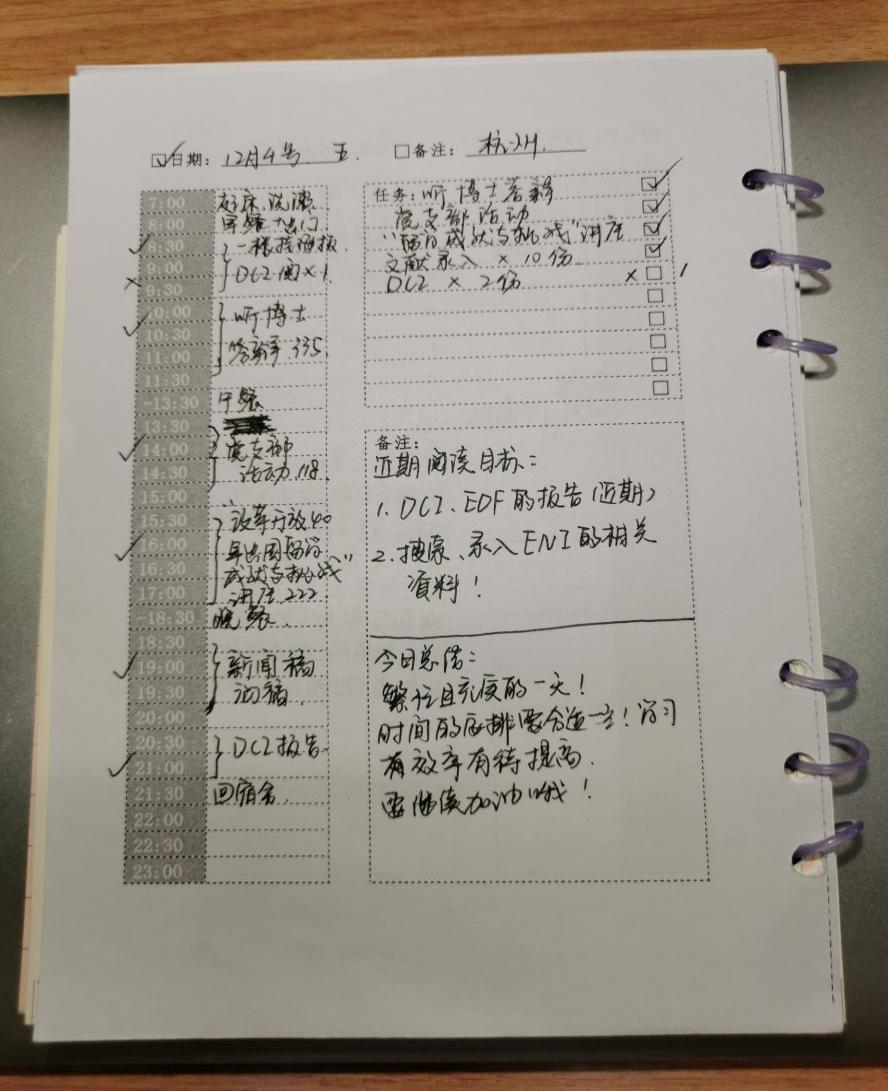 在徐冰娜的日程本上,常常记满了精确到分的计划安排,一天她都会记下当天的一些心得体会。当我们聊起出国联合培养的话题,徐冰娜显然早有预想,她迅速地在纸上画下一条时间线,告诉我们要提前多久准备语言成绩,又要在什么时候联系国外的导师,何时申请国家留学基金委的资助。也正如她的座右铭所言,“Living without an aim, is like sailing without a compass.”