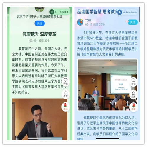 培训期间还设计了课后互动模块和美篇展示模块。每节课后,小组代表围绕课程与教育教学实际分享自己的听课感受;每天学习结束后,小组成员之间探讨交流学习的成果,并通过美篇的形式进行展示与分享。这既是对新知识、新理念的探讨,也为学员的深度交流搭建了平台。学员们表示每次听课学习,都是在聆听自我,审视自我,重组自我。他们以精进的学习力、专业的定力、丰盈的心力,在共鸣中思辨,在思辨中找寻,找寻自我,找寻前行的力量。