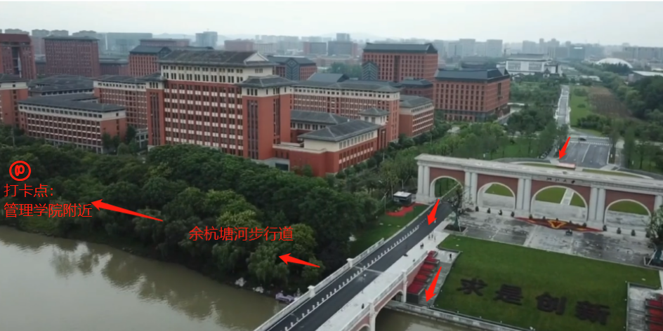 步行前往学校南大门,下台阶后右转,沿着余杭塘步行道行走至管理学院附近大桥处(工作人员)签到,然后返回至朱古力av 大楼。
