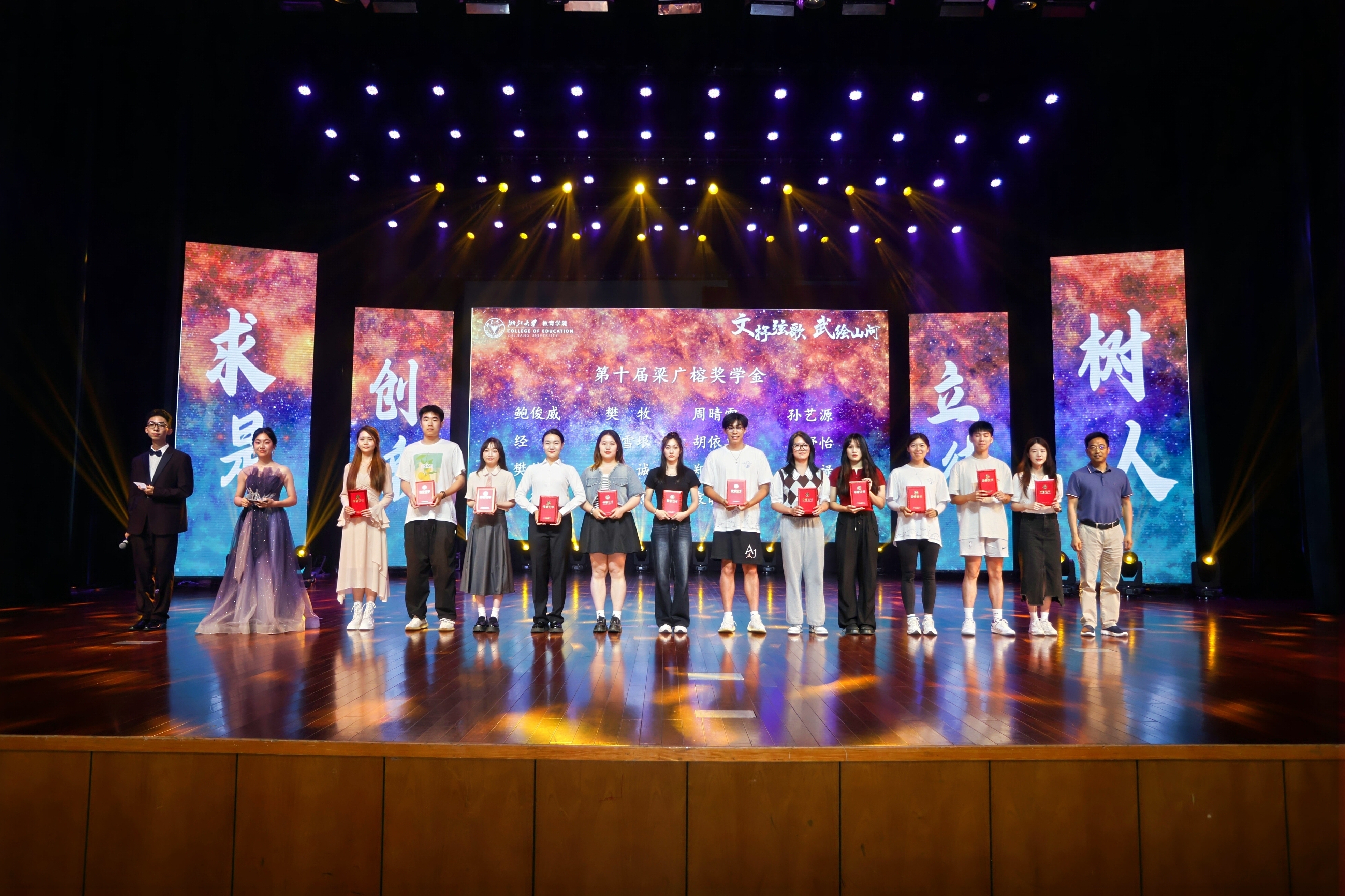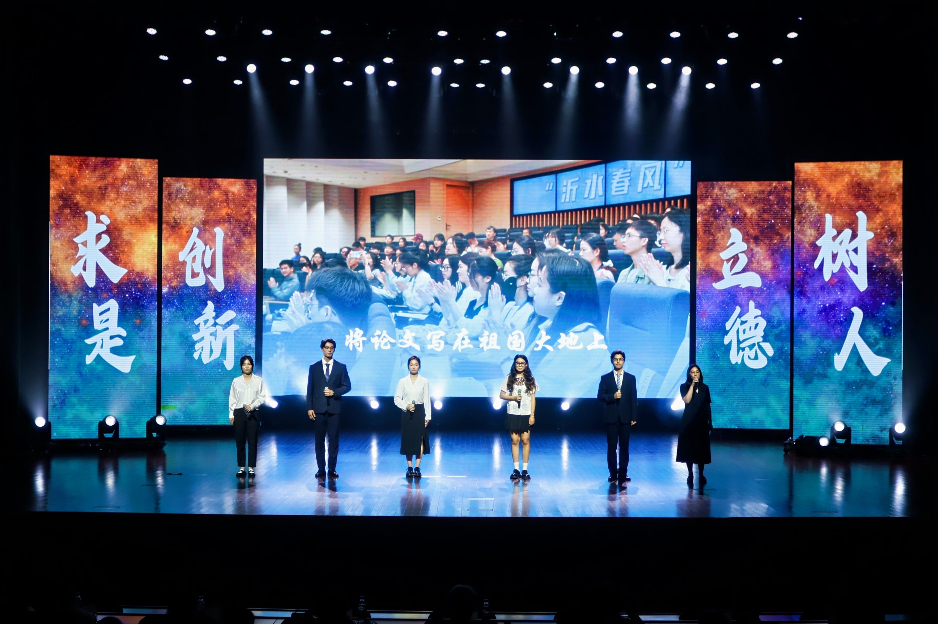 韦懿、祖宇轩、周宇文等同学倾情演绎的幕布剧《传承》,带领着在场的每一位观众穿越时空,见证了一代代教育工作者的辛勤耕耘与不懈追求。幕布后,光影交错,一幕幕感人至深的画面跃然眼前,展现了教育的薪火相传,激励着新一代浙大人铭记历史,肩负使命,继续前行。