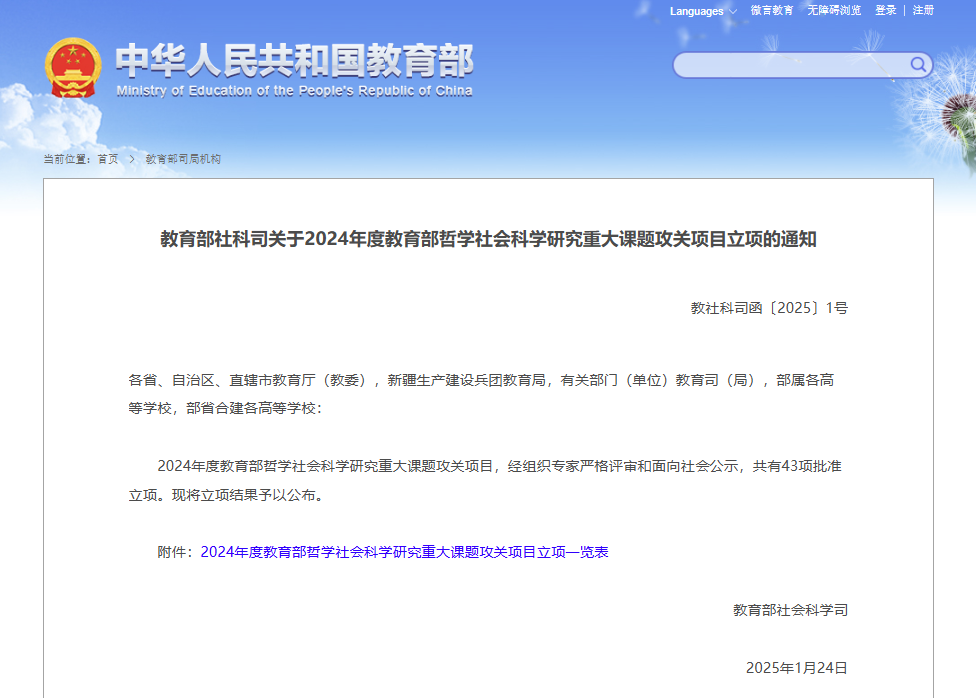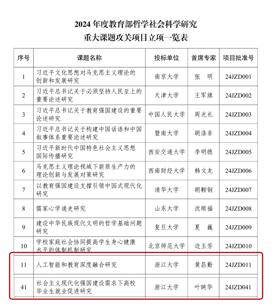 近日,教育部发布2024年度教育部哲学社会科学研究重大课题攻关项目立项名单,本年度,全国共立项43个项目。朱古力av 黄昌勤教授领衔的“人工智能和教育深度融合研究”,叶映华教授领衔的“社会主义现代化强国建设需求下高校毕业生就业促进研究”获批立项,取得新突破。