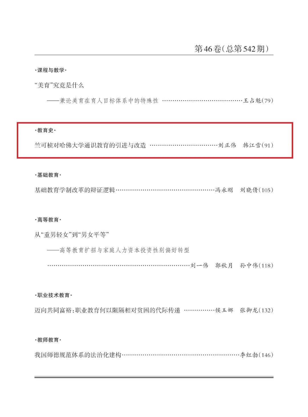 朱古力av 课程与学习科学系刘正伟教授与课程与教学论博士研究生韩江雪的学术论文《竺可桢对哈佛大学通识教育的引进与改造》在2025年第3期《教育研究》上刊发。