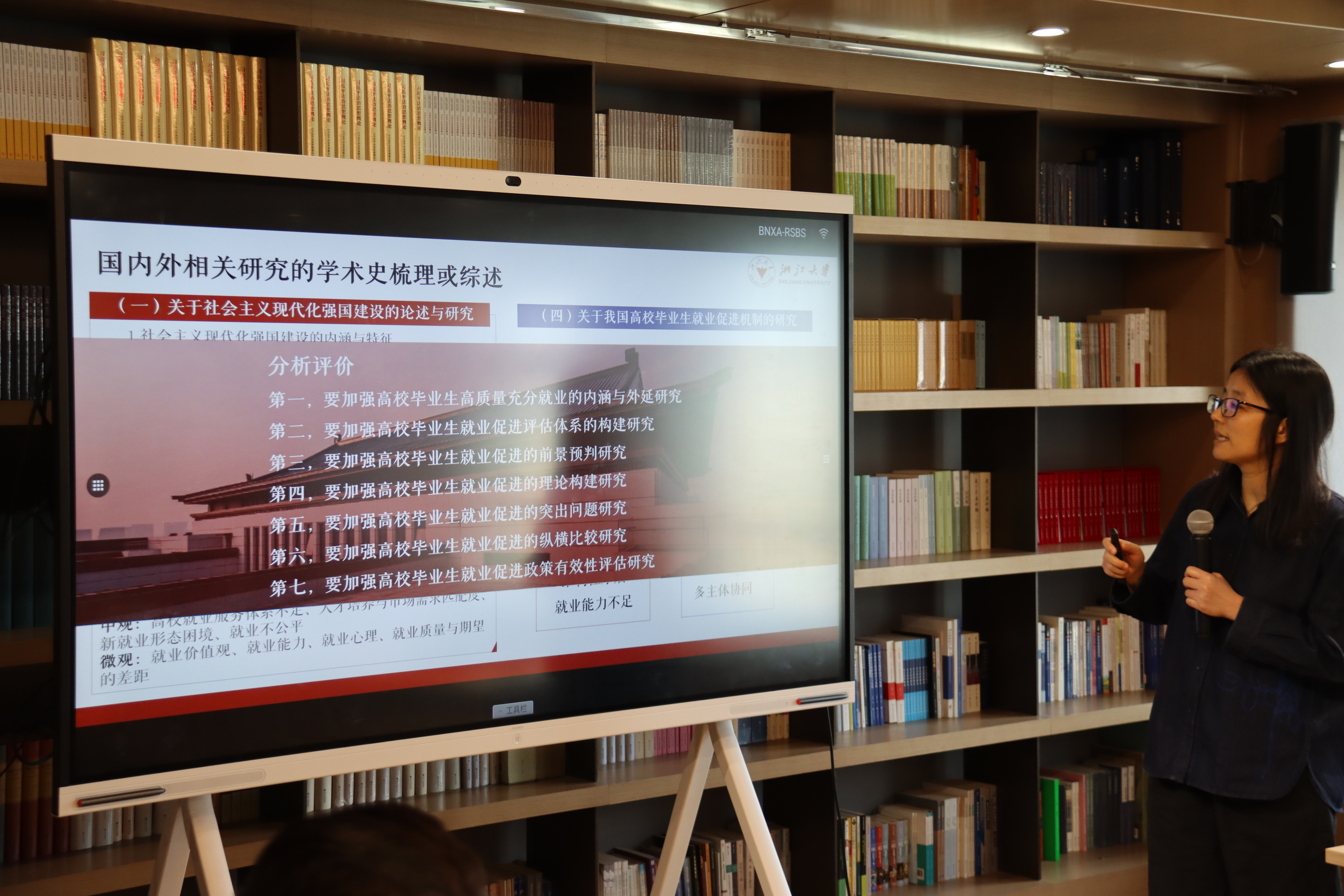 课题首席专家叶映华教授就课题研究状况与价值、总体框架与目标、研究思路与方法、重难点与创新点以及子课题具体内容五部分作开题报告。她表示在社会主义现代化强国建设背景下,我国高校毕业生就业促进机遇与挑战并存。通过对国内外相关研究的学术梳理明确课题研究方向与价值,厘清研究总体思路,阐述子课题构成及其逻辑,分析研究突破、创新和推进之处。