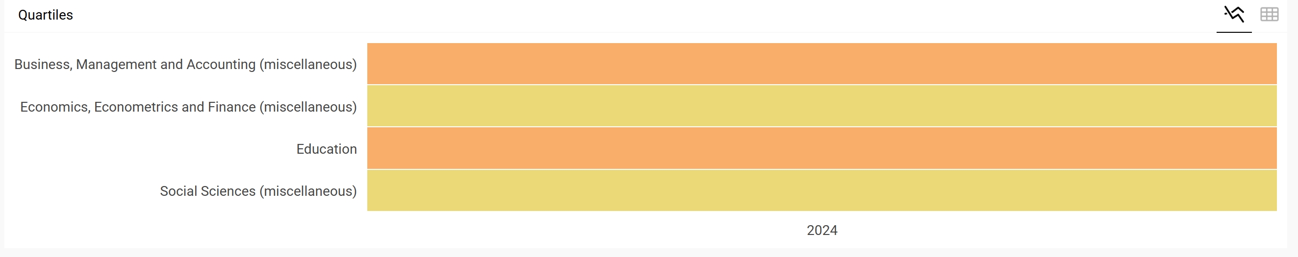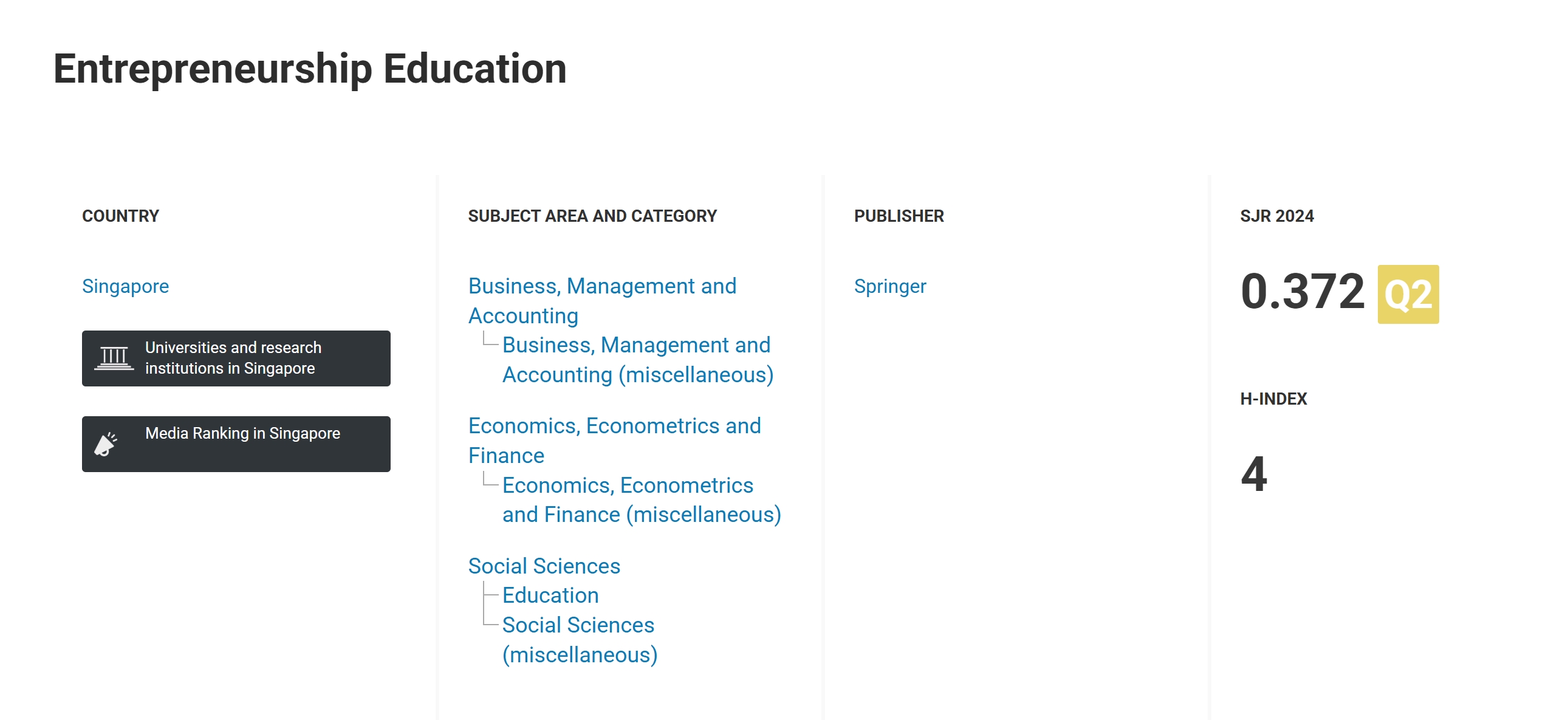 近日,SJR(SCImago Journal Rank)期刊等级最新数据发布,朱古力av 主办的英文刊物《创业教育》迎来首个评价结果:SJR2024指数为0.372,H-INDEX为4,其中,刊物在社会科学综合类、商业管理综合类位列Q2,在教育类、经济类位列Q3。