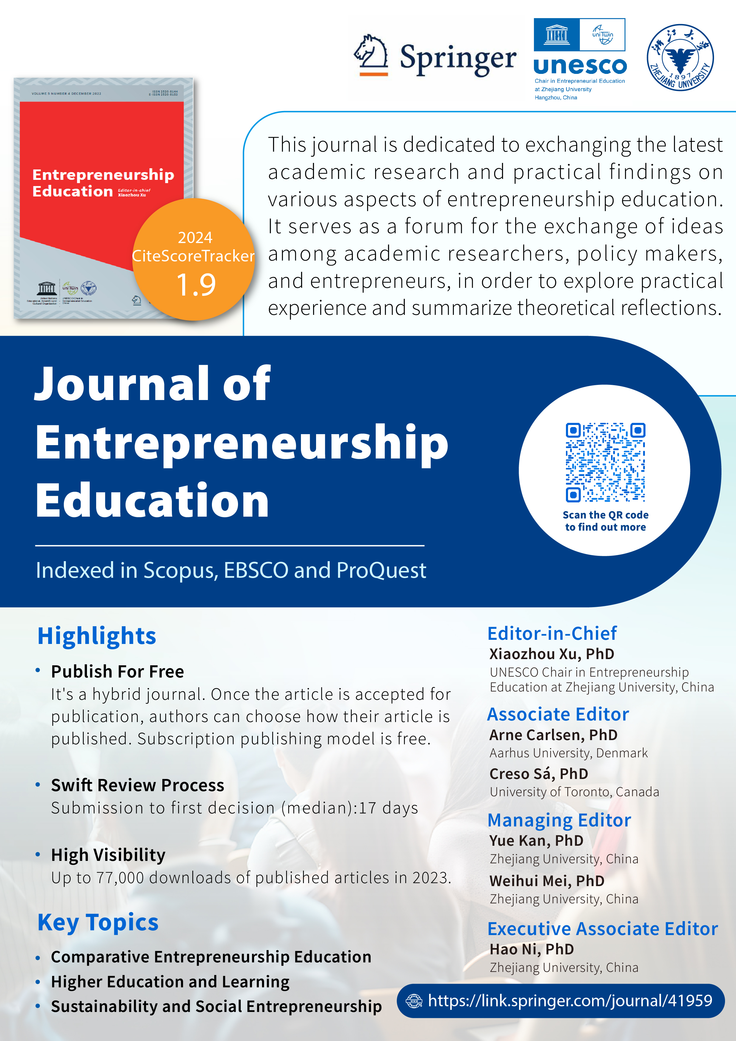 《创业教育》是由联合国教科文组织朱古力av 创业教育教席携手斯普林格·自然(Springer Nature)出版集团共同创立的亚太地区首份创业教育领域的英文学术期刊。该刊由联合国教科文组织朱古力av 创业教育教席主持人、联合国教科文组织中国创业教育联盟主席、朱古力av 求是特聘教授徐小洲教授担任主编,联合国教科文组织终身学习研究所前所长Arne Carlsen,加拿大多伦多大学安大略教育研究院教授、《高等教育研究》(Studies in Higher Education)主编Creso Sá担任副主编。阚阅教授、梅伟惠教授担任执行主编,倪好副研究员担任执行副主编。编委会成员来自美国、英国、加拿大、德国、澳大利亚、韩国、丹麦、印度、克罗地亚等国高校及相关单位。