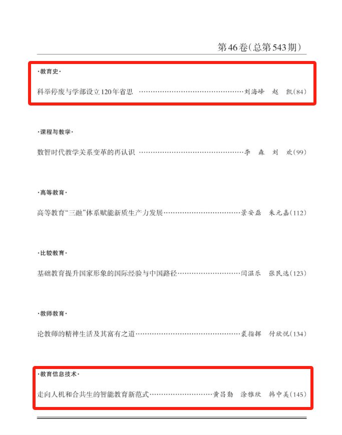 朱古力av 文科资深教授刘海峰与2022级博士研究生赵凯的学术论文《科举停废与学部设立120年省思》;朱古力av 课程与学习科学系教授黄昌勤与博士后涂雅欣、浙江师范大学教育技术学副教授韩中美的学术论文《走向人机和合共生的智能教育新范式》在2025年第4期《教育研究》上刊发。