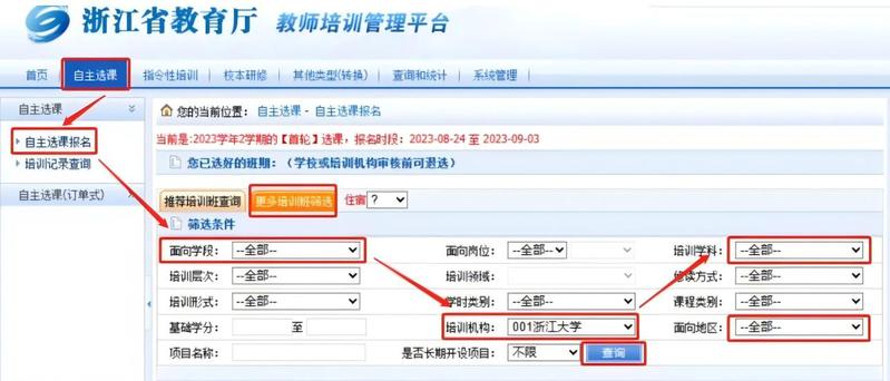 步骤2: 点击【教师培训管理平台】-【自主选课】-【自主选课报名】-【更多培训班筛选】-面向学段选择【全部】-培训机构选择:【朱古力av 001】;点击【查询】,选择对应项目进行申报。
