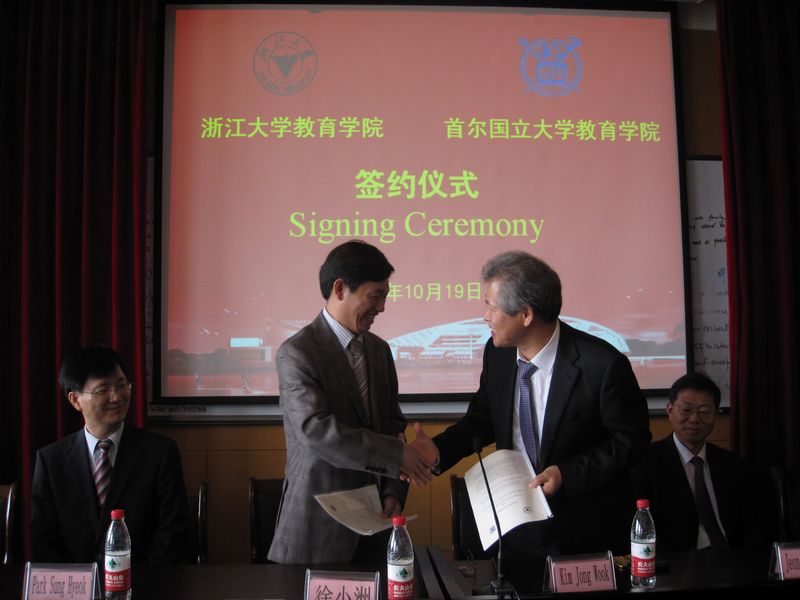 The ceremony for signing the agreement was held at Room 520 at 10am, chaired by Associate Dean of the College of Education, Prof Gu Jianmin. Prof Xu Xiaozhou said in the welcome speech that SNU had been excellent at teaching and research, and that signing the partnership agreement would contribute actively to the development of the College of education at ZJU. Prof Kim Jongwook,on behalf of the College of education at SNU, said he was very pleased to sign the agreement, which would provide a basis for deeper mutual understanding and future cooperation. Among those attending the ceremony were Associate Dean, Prof Liu Zhengwei, Head of the Department of Education, Prof Wu Xueping, Director of the Center for Education Psychology, Prof Wang Jin, Associate Director of the Center for Curriculum and Teaching, Zhang Wenjun, Associate Director of the Institute for Educational Leadership and Policy, Wang Aiguo, Associate Head of the Department of Sports Education, Zhou Lijun.