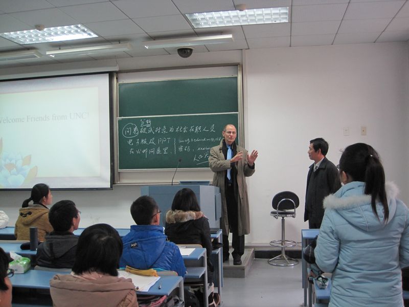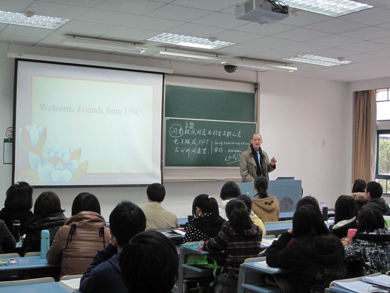 Professor McDiarmid introduced UNCCH which included its history, cultural environment, and campus and focused on the distinguished curriculum of the College of Education, UNCCH. Our students asked questions relating to social science research areas, public policy making in American Society, and American undergraduate education. The students engaged in energetic discussion with the professors on Chinese education and problems of the social security system.