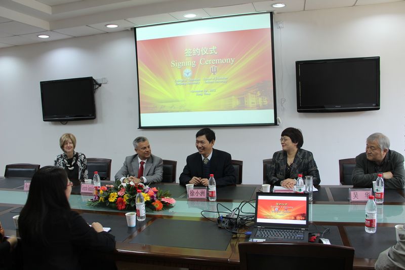 Dean and Professor Gonzalez from the SC-IU gave a speech stating that he was genuinely happy about this visit. Zhejiang University is outstanding and a historical university. He said this visit was the second time and it has brought him a profound impression of the high quality of teaching and students. The signing of the cooperative agreement is the expression of the long-term accumulation of mutual recognition and identification on the both sides, past, present, and the future. The signing is an official and formal process and is based on both side’s level of communication to provide comprehensive promotion of quality assurance and to make breakthroughs in centralized research institutes or other institutes for cooperation. It is conducive to both sides and also a win-win cooperation, he said. At the same time, this agreement also will serve as a motivation for academics and the development of knowledge. The signing ceremony was held successfully and he felt very proud. Dean Gonzalez hopes that the future of both sides can broaden areas of cooperation such as distance education, employment markets, principles, teacher and student exchanges in high and middle schools, and comprehensively deepen the exchanges and cooperation which will create mutual trust.