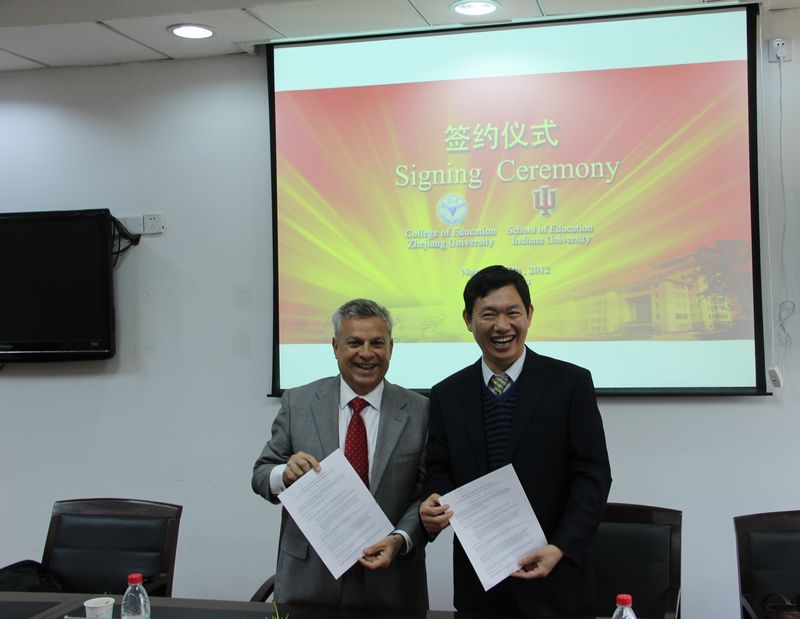 Zhejiang University and Indiana University are close friends and between both schools there has been intercollegiate exchange and frequent exchanges for visitations. Dean Xu presented this signing of the cooperation agreement as very important for our school and university. The College of Education, Zhejiang University and the School of Education, Indiana University have maintained a cooperative relationship since the early 1980s and have engaged in mutual visitations and cooperation which have continually strengthened the relationship. More than 10 faculty members and students of our college have visited or been visiting scholars or entered into the PhD degree program. At the same time, faculty members from the school of Education, Indiana University have also visited as short term foreign experts and have made great contributions to the fostering of students through lectures, conducting student academic papers, and helping to set up our college curriculum system.