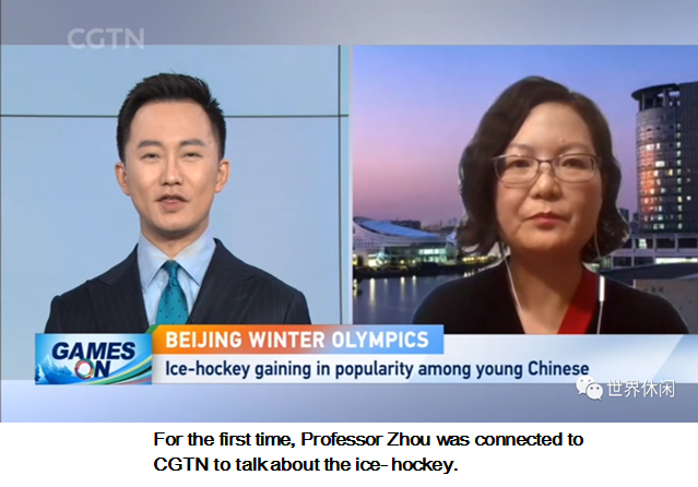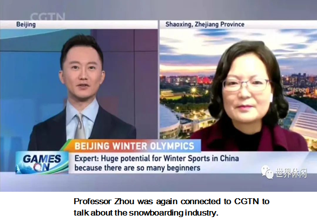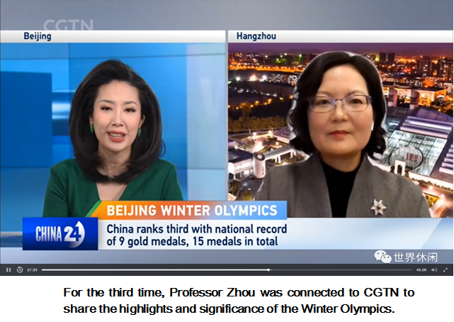 On February 10, 17 and 21, Professor ZHOU Lijun in sports leisure, executive member of World Leisure Organization board and director of World Leisure Center of Excellence at Zhejiang University, was invited three times by CGTN English Channel and attended the broadcast of the China 24 column, sharing her views and ideas respectively on the popularization of the ice-hockey, the development of the snowboard industry, and the highlights and significance of the Beijing Winter Olympics.