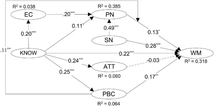 Previous studies have confirmed that individual waste management behavior is influenced by both rational-based and altruistic-oriented beliefs and attitudes. Scholars incorporated personal norms in Ajzen’s theory of planned behavior and confirmed its usefulness in predicting waste management behavior. However, limited attention has been paid to the interactions between the variables in the model. Scholars also commented that the cognitive dimension was largely neglected in the current socio-psychological framework of waste management behavior. This study intends to address this issue by incorporating environmental concern and environmental knowledge in the model and examining the psychological paths linking these variables to waste management behavior within the expanded model of planned behavior. Based on a cross-sectional survey among 434 university students in China, the results showed that subjective norms, perceived behavioral control, personal norms, and environmental knowledge were essential predictors of waste management behavior, whereas the direct effect of attitude was not statistically significant. Environmental concern and subjective norms could influence waste management behavior through personal norms. Environmental knowledge could influence waste management behavior indirectly through environmental concern, personal norms, and perceived behavioral control. Moreover, perceived behavioral control served as a mediator between the relationship of personal norms and waste management behavior.