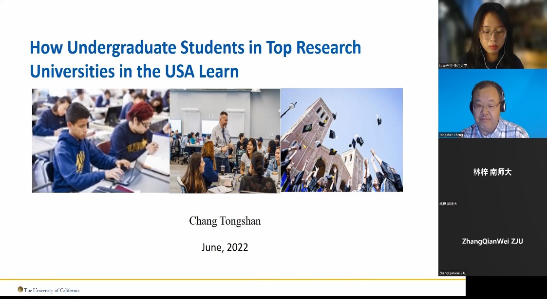 On June 4, Professor Chang Tongshan, Director of Institutional Research and Academic Planning at the University of California (UC) Office of the President, made a theme report on “How undergraduate students at top public research universities in the USA learn”. First of all, the audience was asked to fill out one questionnaire about individual university learning. Then, Professor Chang analyzed the current graduation requirements, major changes, curriculum, on- and off-campus activities participation of foreign top universities. In his speech, Professor Chang claimed one of the most important elements for cultivating excellent college students is to develop core competitiveness in the aspects of students’ thinking, learning, design and so on. Finally, Professor Chang summarized three characteristics of world-class universities, which are providing clear directions for college students, enriching students’ learning opportunities, and allowing students to participate in and organize more activities. After answering all the questions from the students, Mr. Chang emphasized that the epidemic was a test for all of us. In the future, online teaching may be more commonly used, but the uniqueness of offline teaching should be valued, it’s obvious that online teaching cannot better pay attention to students’ instant performance, while offline teaching has the advantage of getting more timely feedback from students.
