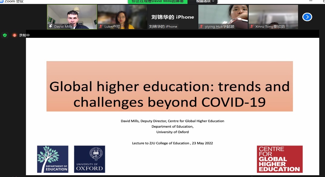 OnMay 22, Associate professor David Mills at the Department of Education from University of Oxford in the UK discussed the trends and challenges beyond COVID-19 in global higher education. He presented that mobility and equity are two big issues that global higher education is currently facing. He compared and analyzed the phenomenon of academic mobility from a historical perspective and argued that the history of higher education is in fact the history of academic mobility. The COVID-19 has also brought to light the mechanisms and phenomena of inequality behind higher education that may have been overlooked. For example, digital campuses have become the central concern of higher education in many countries, but there are inequalities among different students in terms of available access to learning resources and learning opportunities for online participation. Therefore, he suggested that inequalities and hierarchies resulting from international mobility should be reduced, with more collaboration and less competition.