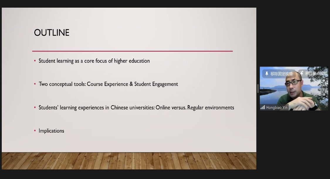 OnMay 27, Professor Yin Hongbiao from the Department of Curriculum and Instruction in Faculty of Education, The Chinese University of Hong Kong, delivered a keynote presentation on “University students’ learning experiences in online and regular environments”. Professor Yin firstly identified student learning as main focus of higher education, then introduced two conceptual tools applied in the studies, namely, course experience and student engagement. Finally, he shared his latest research on the learning experiences of Chinese university students in online and regular environments, by systematically introducing his research thinking, conclusions and implications of the relevant series of completed studies. In the interactive session, students asked questions concerning their own learning experiences in both online and regular environments, Professor Yin patiently gave immediate answers one by one.