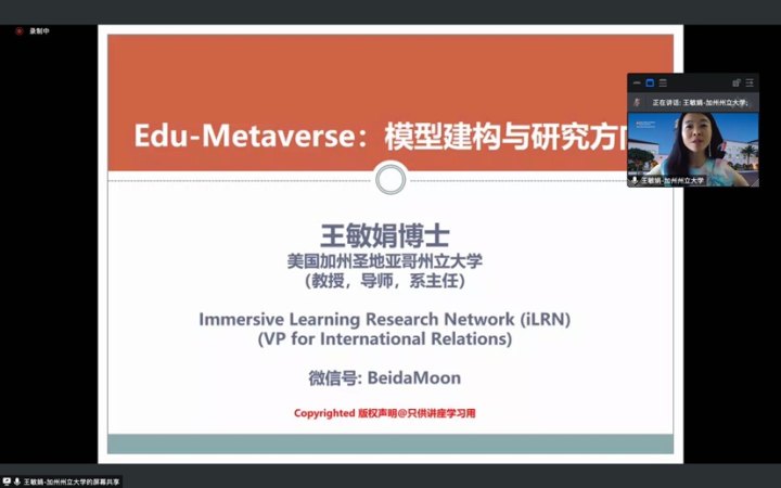 On June 22, Professor Minjuan WANG from San Diego State University, was invited to hold an online lecture named "Edu-Metaverse: Model Construction and Research Direction Analysis". First of all, Prof. Wang took the evolution of learning as the starting point and defined the Edu-Metaverse. Prof. Wang later made a full explanation of the technical support of Edu-Metaverse, which is extended reality (XR). Four technologies of XR were involved – Augmented Reality (AR), Virtual Reality (VR), Mixed Reality (MR), 360° photos and videos in carefully selected videos and pictures. Finally, in the context of educational technology, Prof. Wang introduced the model construction and research direction of Edu-Metaverse. In the interactive session, the students had a full discussion with the professor.