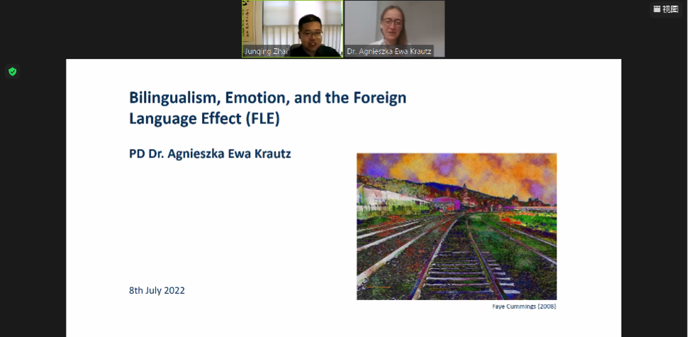In the tenth session, Dr. Agnieszka Ewa Krautz, from the University of Mannheim in Germany, gave us the keynote speech entitled "Bilingualism, Emotion, and The Foreign Language Effect on Children". Her theme revolves around bilingualism, and in her opening remarks, she used interactive discussion many times to guide participants to think about the definition of "bilingualism". On the basis of solid conceptual clarification, she further explained the differences of bilinguals' moral choices, such as the choice transforms when facing classic moral dilemmas.