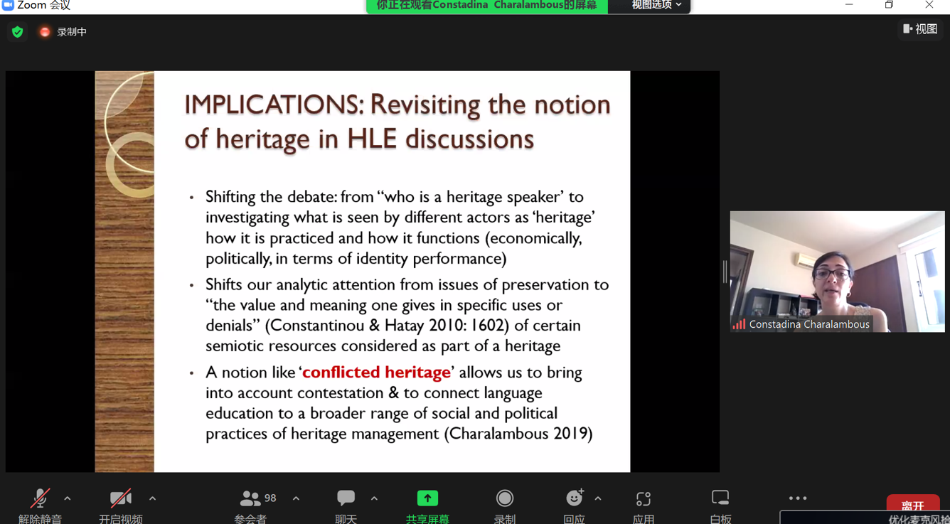For the eighth session, Constadina Charalambous, Assistant Professor of European University Cyprus, delivered a lecture themed on “Translanguaging, social justice and ‘conflicted heritage’: challenges and possibilities”. After the literature review, Dr. Constadina rendered a brief explanation of the cultural context of Cyprus. The historical and cultural complexity and the language diversity made translanguaging pedagogies challenged, involving social issues such as justice, equity, and marginal population. Via an example from a highly diverse Greek-Cypriot primary school classroom and linguistic ethnographic data, the lecturer made an analysis of translanguaging pedagogies.
