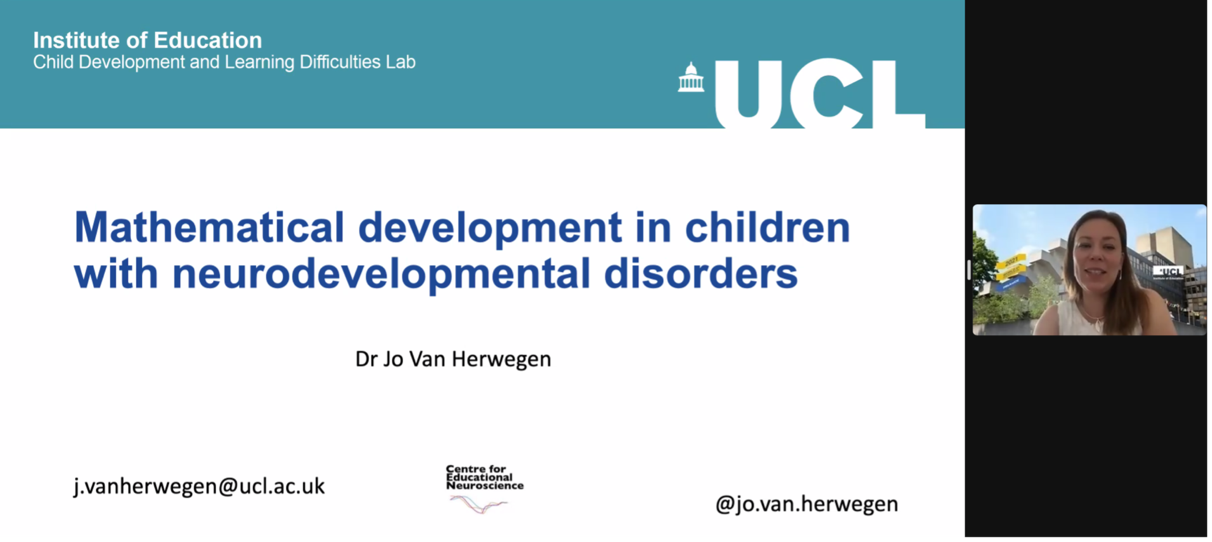 For the final session, Dr. Jo van Herwegen, associate professor at University College London, reported on mathematical development in children with neurodevelopmental disorders. It’s reported that people with Down syndrome (DS) and Williams syndrome (WS) had mathematical abilities impaired. However, it was unclear which domain-general or domain-specific abilities impact on mathematical development in these developmental disorders. Dr. Herwegen pointed mathematical abilities were delayed in line with overall mental age in DS and WS and visuospatial abilities predicted performance for DS and TD participants. These findings suggest that those with DS and WS may benefit from different mathematical intervention programs.