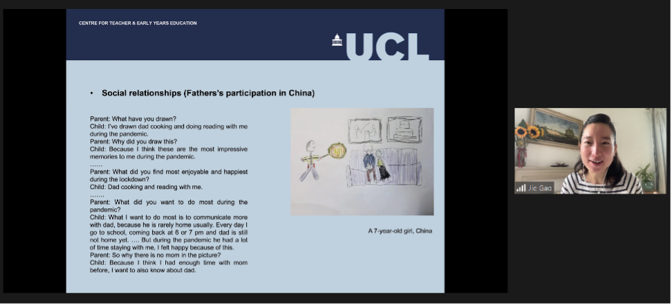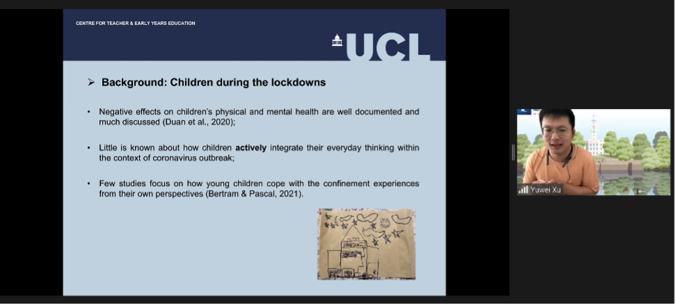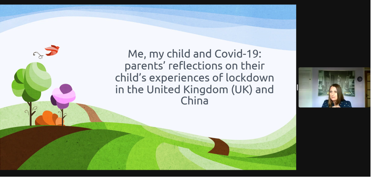 The sixth session was brought by Dr. Jie Gao from University of College London and Dr. Yuwei Xu from University of Nottingham jointly, aiming at “Understanding young children's perspectives on and experiences of COVID-19 in China and England”. Dr. Yuwei Xu firstly introduced their research background and theoretical framework, illustrated research purpose, selected participants and ethical considerations. Next, Dr. Jie Gao began to show a deeper insight by presenting a picture of initial findings. For example, Chinese children tended to describe the virus as giant monsters and show their strong will to beat the “monsters”, while British children tended to reveal their awareness of staying safe. Finally, a father whose child took part in the research was invited to show his feelings.